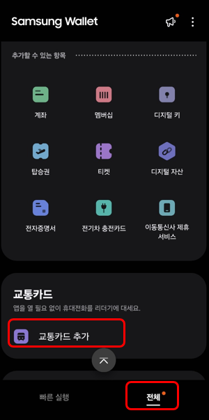 일반적으로 삼성월렛에서는 빠른 결제를 위해서 빠른실행 모드가 실행될텐데요. 하단의 전체를 눌러서 메뉴를 불러오고 교통카드 - 교통카드 추가 메뉴를 눌러줍니다.