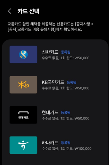이때 체크카드의 경우 후불 교통카드 사용을 위해서는 카드사별로 체크카드 소액신용결제 서비스를 등록해야지 사용이 가능합니다. 소액신용의 경우 30만원 한도 내에서 신용카드처럼 사용할 수 있게 해줍니다.