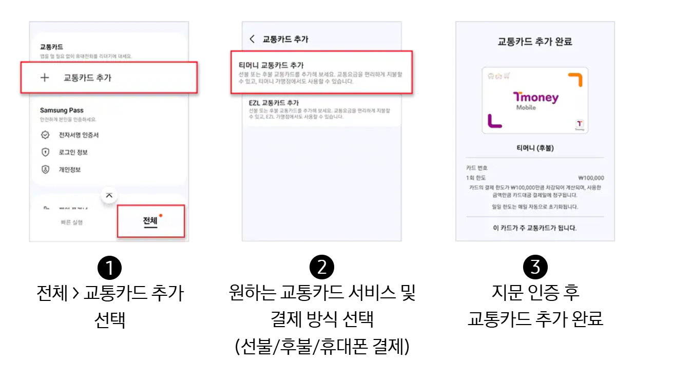 갤럭시 S25에서 교통카드 등록은 공식 가이드에 따라서 아래처럼 등록이 가능한데요.