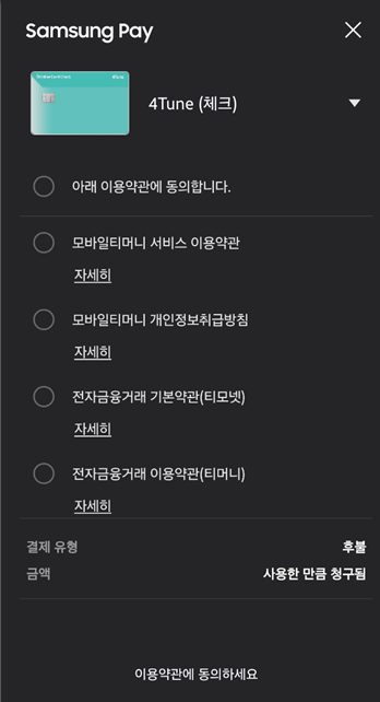 카드사를 선택하고 이용약관에 동의하면 이제 갤럭시 S25 삼성월렛 교통카드 발급이 모두 완료되었습니다.