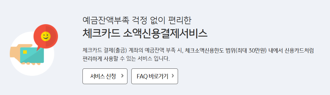 이용안내 예금잔액부족 걱정 없이 편리한 체크카드 소액신용결제서비스 체크카드 결제(출금) 계좌의 예금잔액 부족 시, 체크소액신용한도 범위(최대 30만원) 내에서 신용카드처럼 편리하게 사