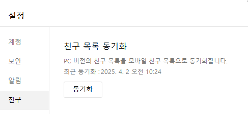 그리고 여기에서도 설정 - 친구 - 친구 목록 동기화를 통해서 친구 목록을 동기화 해줍니다.