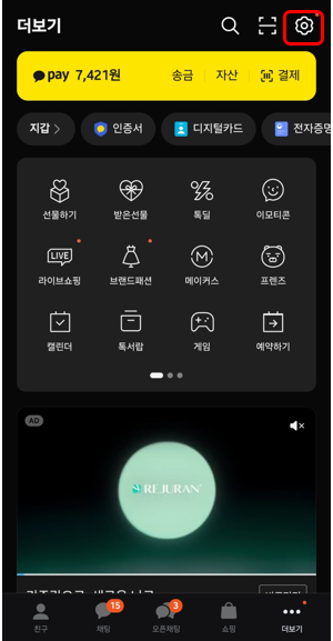 먼저 카카오톡에서 더보기 상단에 톱니바퀴(설정) 메뉴로 들어갑니다.