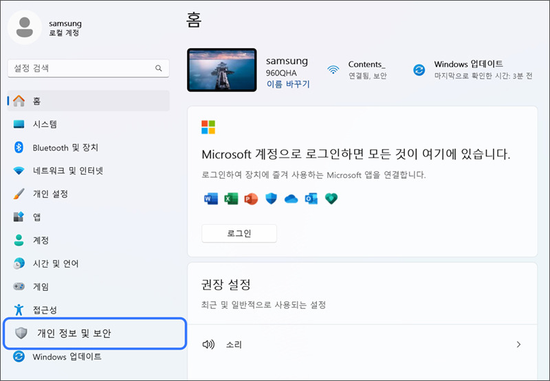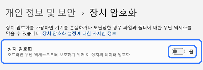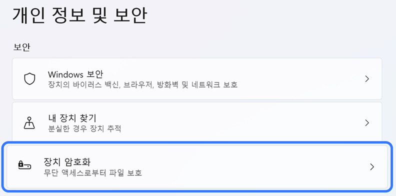 일반적으로 설정 - 개인 정보 및 보안 메뉴에서 비트로커 암호화를 끌 수 있는데요.