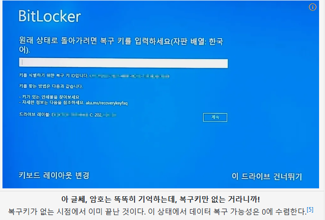 이 장치 암호화(Bitlocker) 기능이 설정되어 있는 상태에서 TPM 초기화, BIOS 업데이트, 메인보드 교체 등의 작업이 진행될 경우 복구 키를 요구할 수 있습니다.