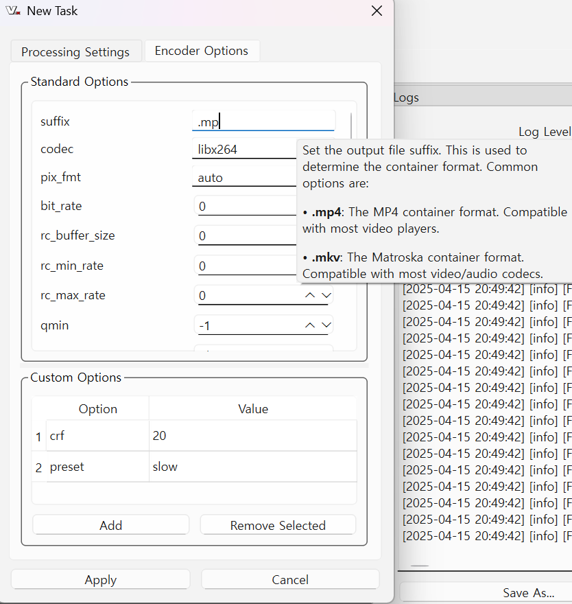 설정에서 출력을 mp4나 mkv 중 택할수 있습니다.