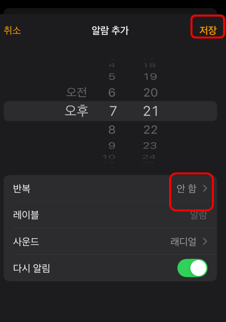 원하는 시간과 반복 방법 등을 선택하고 저장을 눌러줍니다.