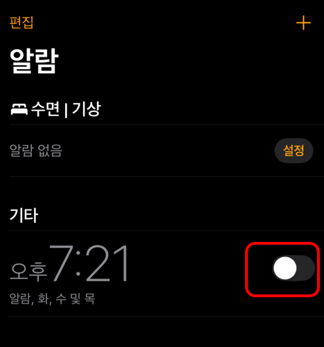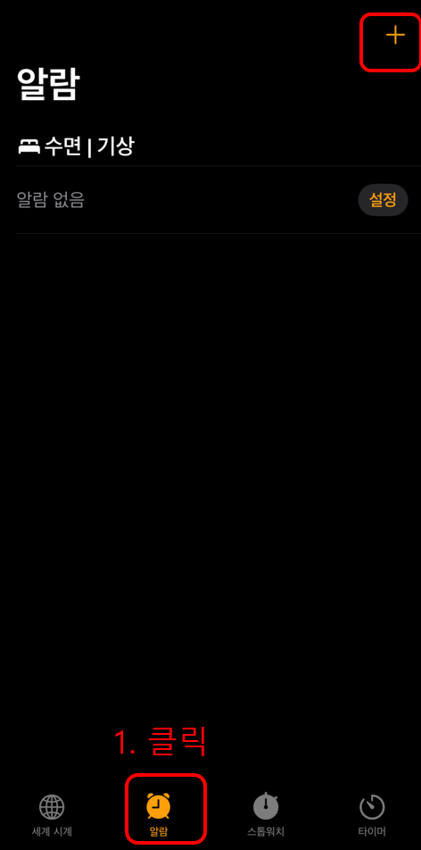 알람 메뉴에서 상단의 +를 누르면 알람을 추가할 수 있습니다.