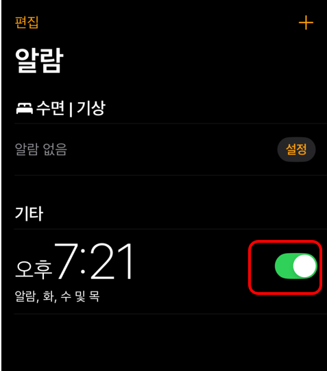 간단하게 아이폰 알람을 끄기 위해서는 저 초록색을 클릭해서 회색으로 변경하면 됩니다.