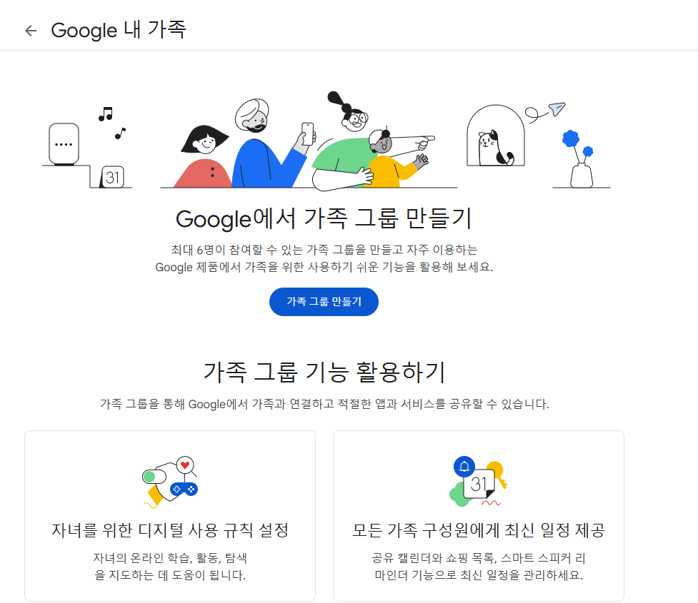 구글에서는 최대 6명이 참여할 수 있는 가족 그룹을 만들 수 있는데요. 가족 그룹은 한 명의 관리자가 최대 5명의 다른 가족 구성원을 초대하여, 구글의 다양한 유료 서비스와 콘텐츠를 함께 공유하고 관리할 수 있는 매우 유용한 기능입니다. 가족 단위로 구글 서비스를 이용할 때 비용을 절약하고 편리하게 디지털 생활을 공유할 수 있습니다.