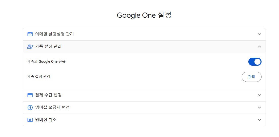 들어가셔서 가족 공유를 누르시고 가족과 google one 공유를 활성화 하시면 됩니다.
