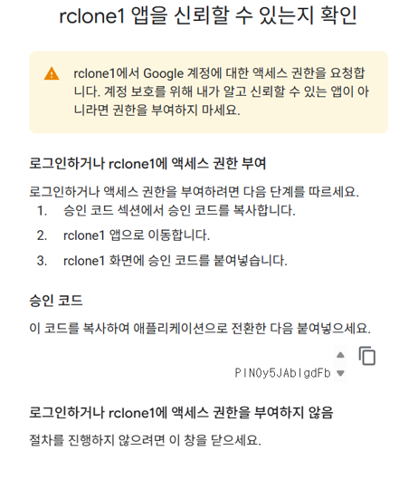 구글 드라이브로 로그인 하여 권한을 허용해 준다음 승인 코드를 넣어주면 모든 연동이 끝납니다.
