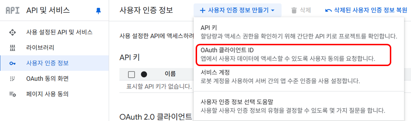 구글 드라이브 콘솔에 들어가서 api 및 서비스 - 사용자 인증 정보 - 사용자 인증 정보 만들기 - oauth 클라이언트 ID를 만들어줍니다.