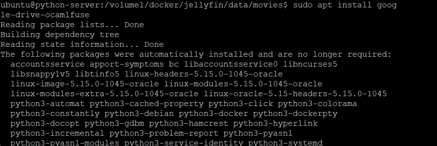 이후 apt-get명령어를 통해서 google-drive-ocamlfuse를 설치해 줍니다.
