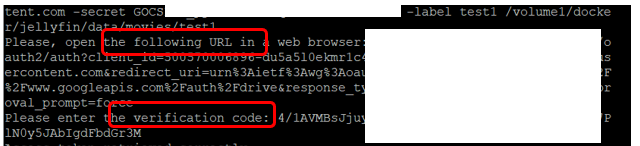 google-drive-ocamlfuse -headless -id {OAuthID}.apps.googleusercontent.com -secret {Password} -label test1 /volume1/test1