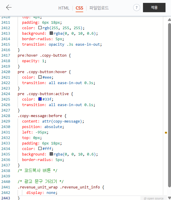이후 CSS 편집 젤 하단에 아래 코드를 넣어주면 됩니다.