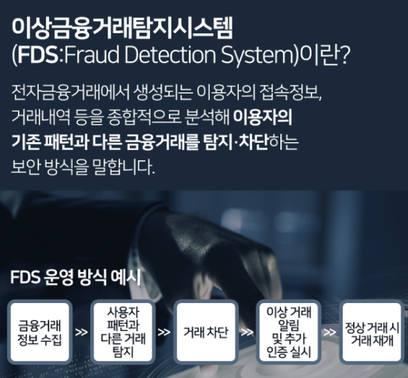 FDS는 "이상 금융 거래 탐지 시스템" (Fraud Detection System)의 약자로, 전자금융거래에서 발생하는 이상 징후를 실시간으로 탐지하고 차단하여 금융사기를 예방하는 시스템입니다. 주로 은행, 카드사, 증권사 등에서 활용되며, 고객의 평소 거래 패턴과 다른 의심스러운 거래를 식별하고 대응합니다.