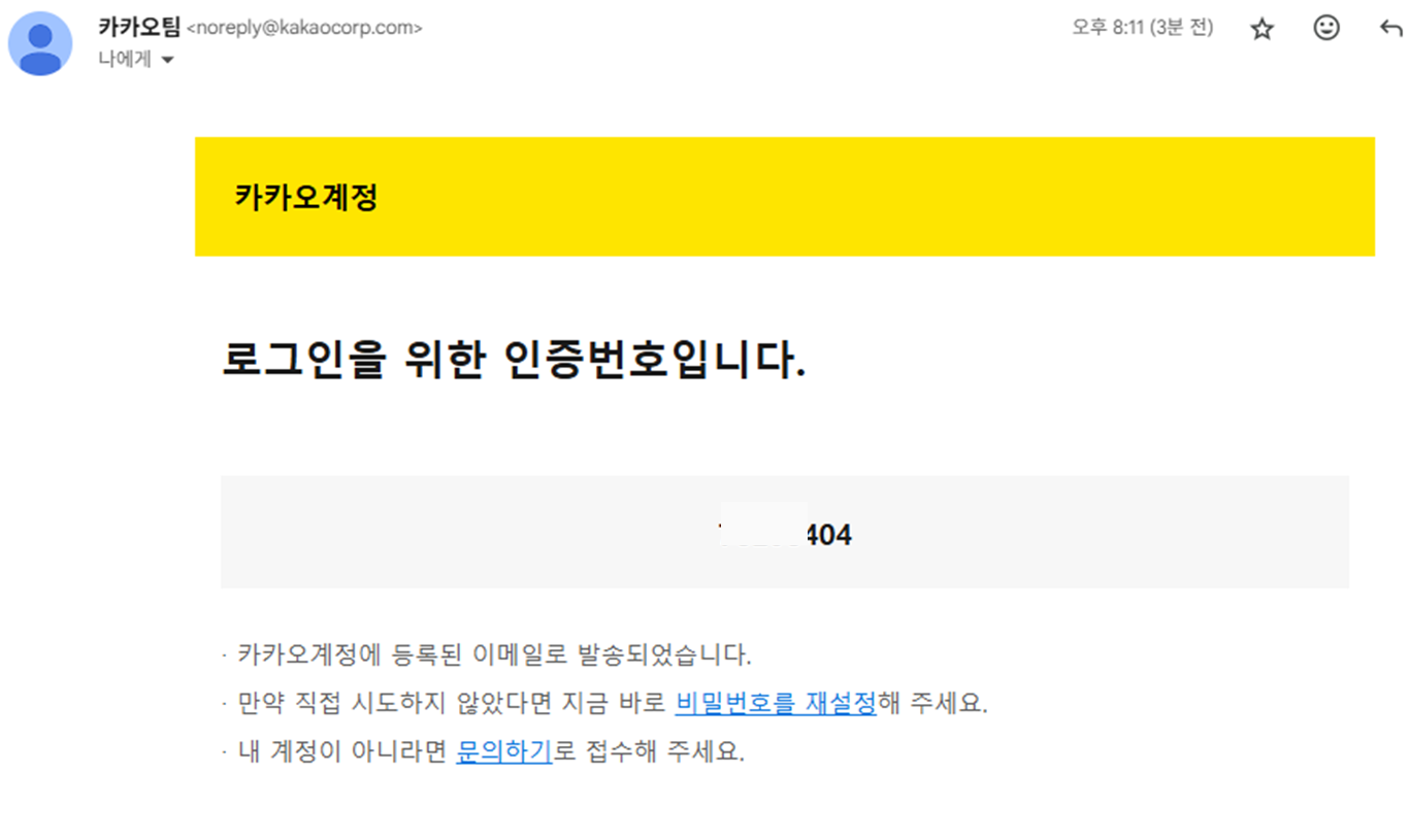 이 때에는 본인이 사용하는 계정의 이메일 주소에서 인증번호를 입력해야 하는데요.