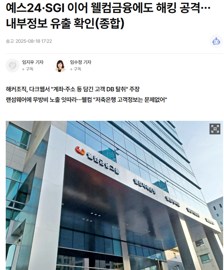 예스24, SGI에 이어서 웰컴금융그룹에서도 랜섬웨어 해킹이 발생했습니다.