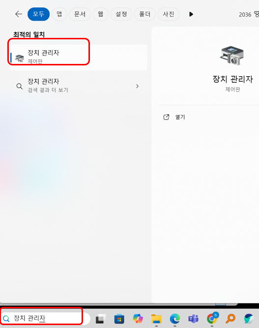윈도우 + R을 눌러 실행에서 devmgmt.msc를 실행하거나 검색창에서 장치 관리자를 찾아서 실행해주세요