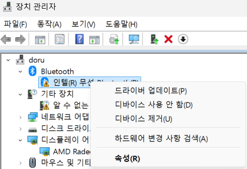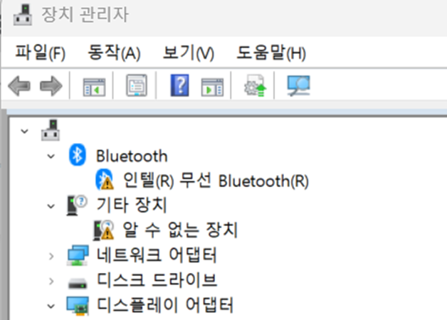 현재 블루투스와 알수 없는 장치에서 문제가 있음을 한눈에 알 수 있습니다.