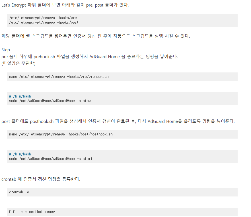 Let's Encrypt 하위 폴더에 보면 아래와 같이 pre, post 폴더가 있다. /etc/letsencrypt/renewal-hooks/pre /etc/letsencrypt/renewal-hooks/post 해당 폴더에 쉘 스크립트를 넣어두면 인증서 갱신 전 후에 자동으로 스크립