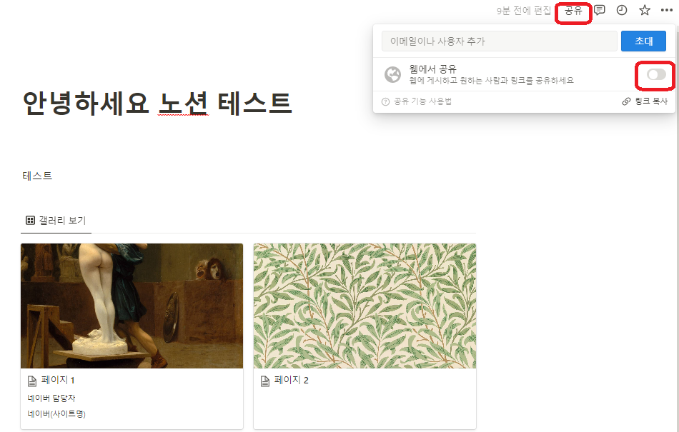 노션의 경우 상단의 공유를 누르고 웹에서 공유를 누르면 간단하게 페이지를 웹에서 공유가 가능합니다.