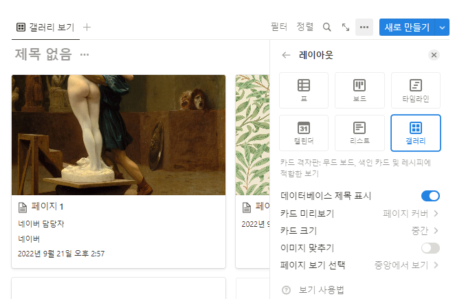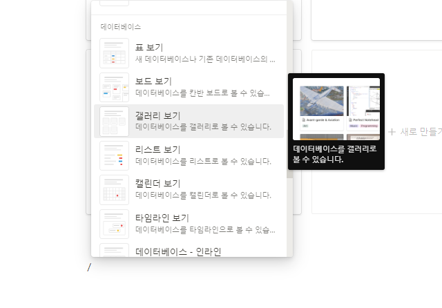 새로운 페이지애서 /을 누르고 하단에 데이터 베이스 - 갤러리를 누르면 갤러리를 만들 수 있습니다.