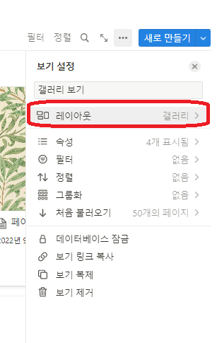 갤러리 보기에서 레이아웃을 클릭하면 이제 갤러리의 레이아웃을 선택할 수 있는데요.