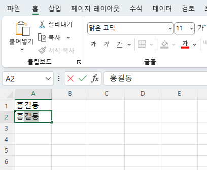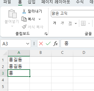 즉 위에 홍길동을 쓰고, 아래애 홍만 쓰면 자동으로 홍길동이 작성되는데요.