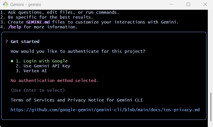 이후 npm을 통해서 gemini cli를 설치해줍니다.