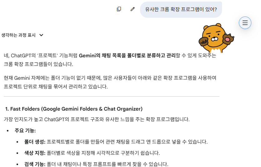 물론 이런 확장 프로그램을 사용하는 것도 있지만, 장기적으로는 Gemini에서 이런 불편함을 인지하고 다음 업데이트에는 공식으로 추가해줬으면 좋겠습니다.