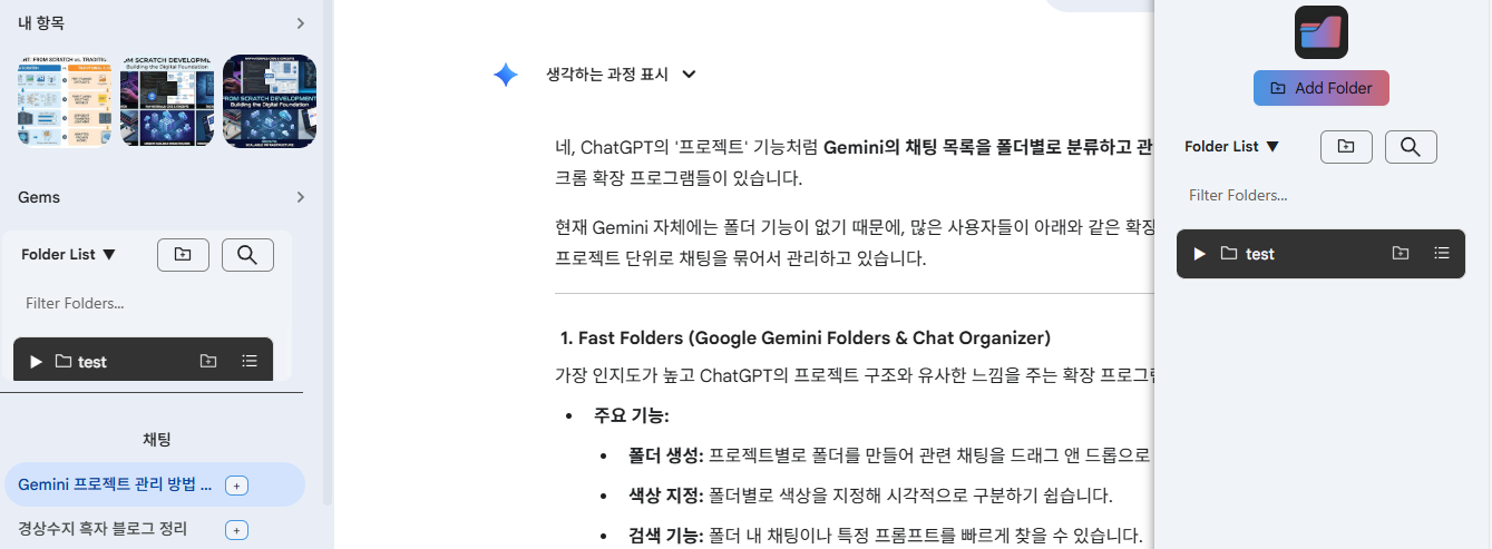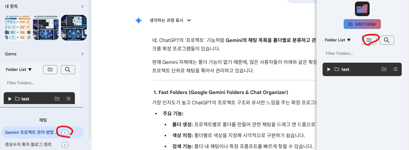 실제 Gemini에서 채팅을 자유롭게 사용하다가 채팅에서 +를 누르면 특정 폴더에 추가할 수 있습니다.