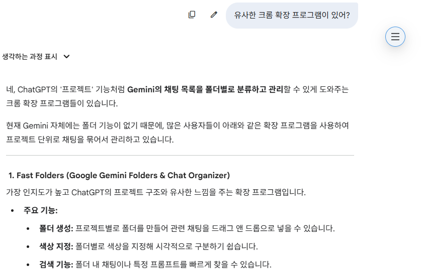 | 1. Fast Folders (Google Gemini Folders & Chat Organizer) 가장 인지도가 높고 ChatGPT의 프로젝트 구조와 유사한 느낌을 주는 확장 프로그램입니다. 주요 기능: 폴더 생성: 프로젝트별로 폴더를 만들어 관련 채팅을 드래그 앤 드롭으로 넣을 수 있습니다. 색상 지정: 폴더별로 색상을 지정해 시각적으로 구분하기 쉽습니다. 검색 기능: 폴더 내 채팅이나 특정 프롬프트를 빠르게 찾을 수 있습니다. 프롬프트 관리: 자주 사용하는 프롬프트를 저장해두고 프로젝트마다 꺼내 쓸 수 있습니다. 추천 이유: 인터페이스가 깔끔하고 Gemini 사이드바에 자연스럽게 녹아듭니다. 2. Gemini Chat Folders 채팅 목록이 많아질 때 계층 구조로 정리하기 좋은 도구입니다. 주요 기능: 무제한 하위 폴더: 폴더 안에 또 폴더를 만드는 중첩 구조가 가능해 대규모 프로젝트 관리에 유리합니다. 데이터 동기화: 구글 계정을 통해 여러 PC에서 내가 만든 폴더 구조를 유지할 수 있습니다. 자동 분류: 설정에 따라 채팅 내용을 분석해 관련 폴더로 자동 분류해주는 기능을 제공하기도 합니다. 3. Folders for Gemini 가볍고 기본적인 폴더 기능에 충실한 확장 프로그램을 원하신다면 적합합니다. 주요 기능: 심플한 드래그 앤 드롭: 아주 직관적으로 채팅을 분류할 수 있습니다. 네이티브 디자인: 구글의 디자인 가이드를 잘 따라서 설치 후에도 이질감이 적습니다. |
