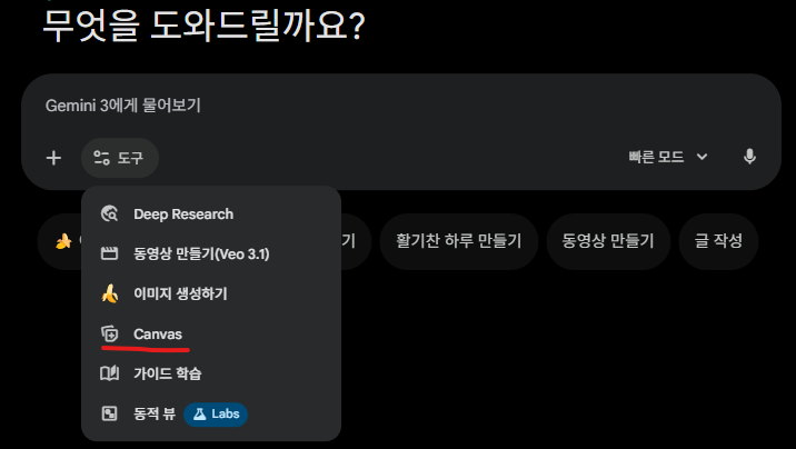 먼저 제미나이의 도구 메뉴에서 Canvas를 선택해 줍니다.