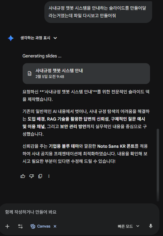 gemini로 슬라이드를 만들기 위해서는 Canvas를 선택해야 합니다.
