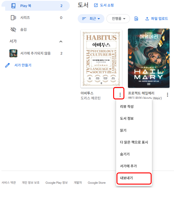 이후 책 하단에 점점점을 눌러서 내보내기를 누릅니다.
