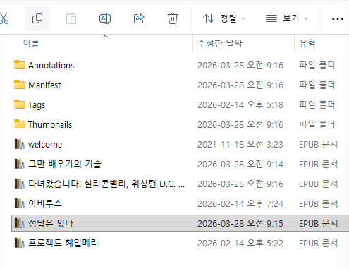 그러면 내문서에 이북파일이 생기는데요. 현재 버전은 암호화가 되어 있는 epub입니다.