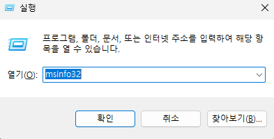 먼저 윈도우키 + R을 눌러서 실행을 실행하고 msinfo32를 실행합니다.