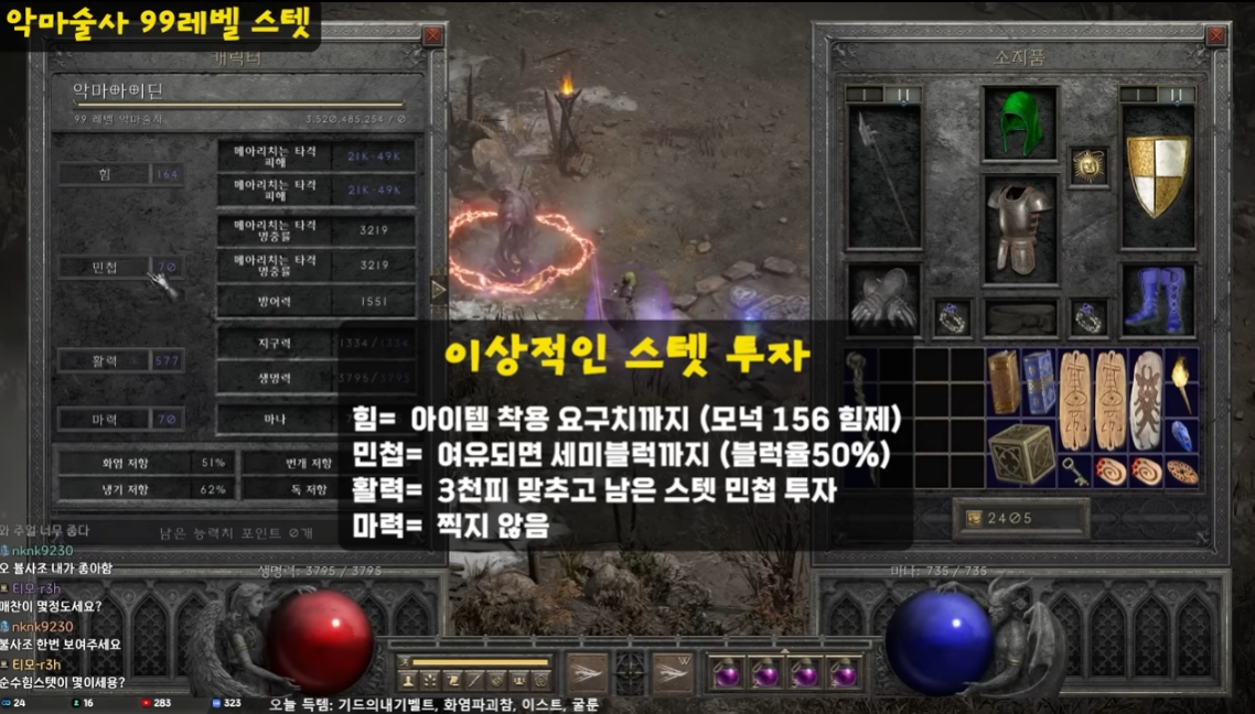 아이템은 온달봉 듥로 세팅하면서 번개저항이 맥스로 맞춰야 한다고 합니다.