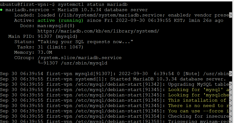 이 후 status를 통해서 버전과 함께 잘 설치되었는지 확인합니다.