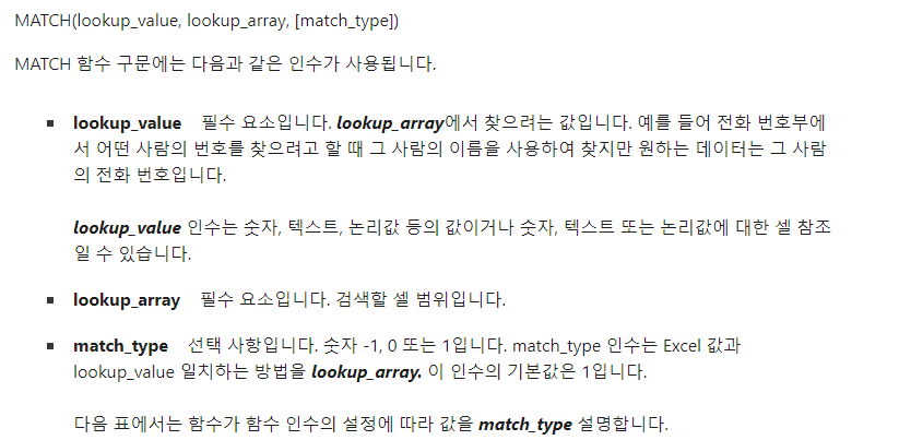 MATCH함수 역시 MS의 공식 홈페이지에서 상세 사용법을 알 수 있습니다.