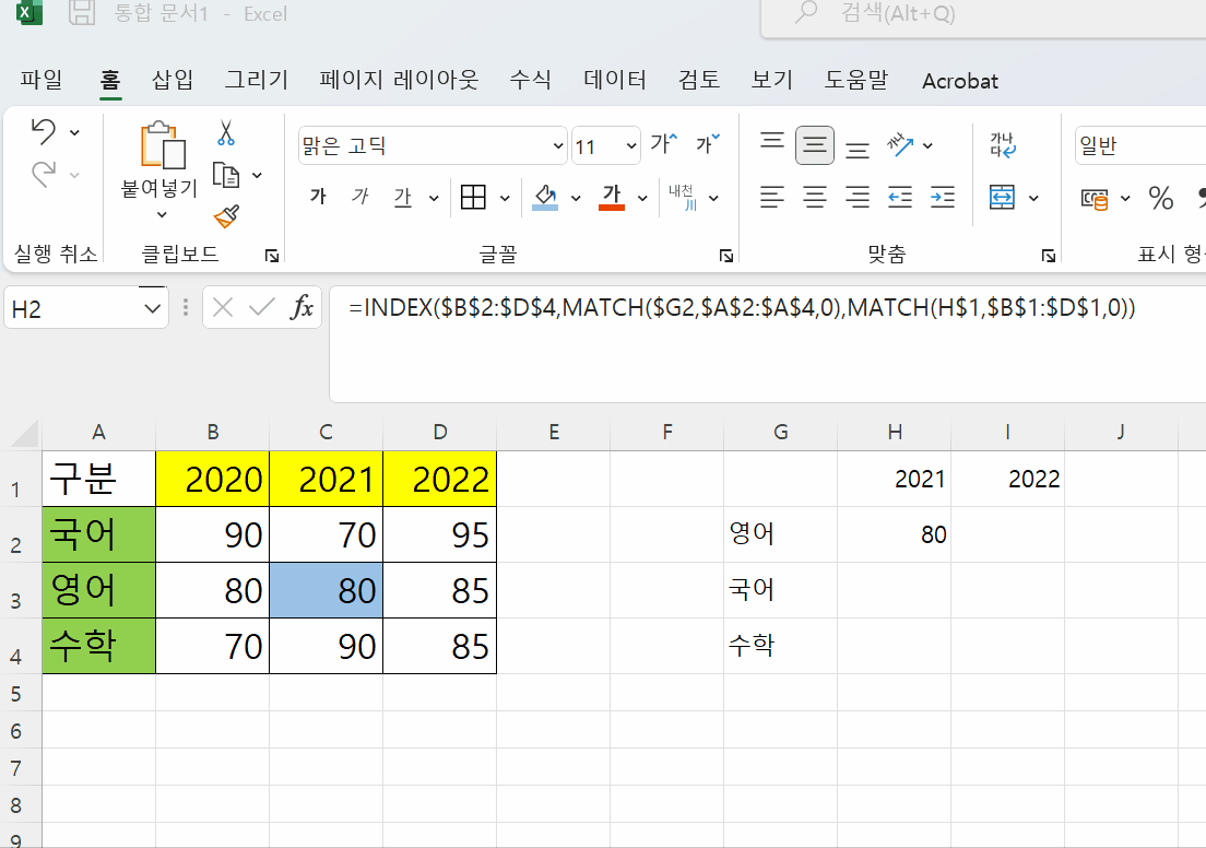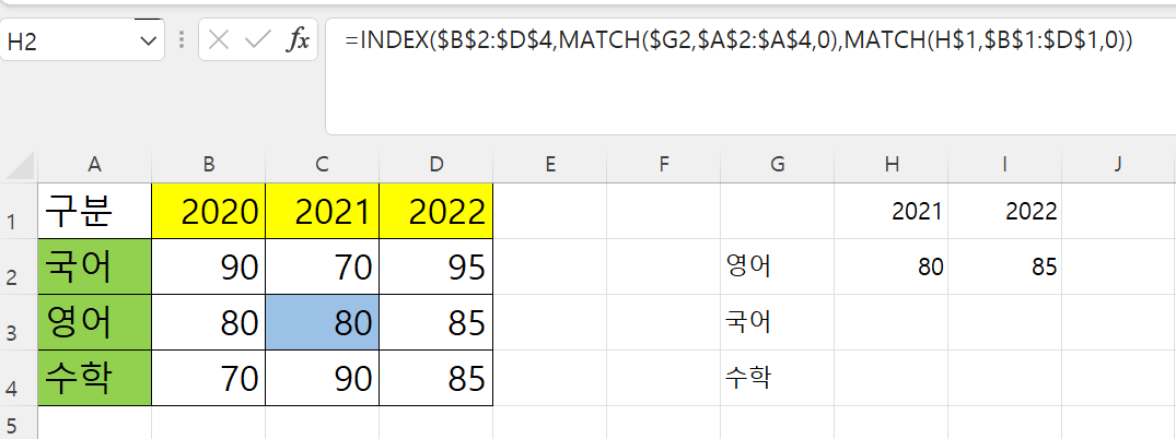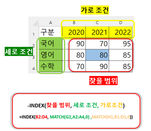 이를 기반으로 함수를 짜보면 아래와 같이 INDEX함수와 Match함수를 활용해서 값을 구할 수 있는데요.