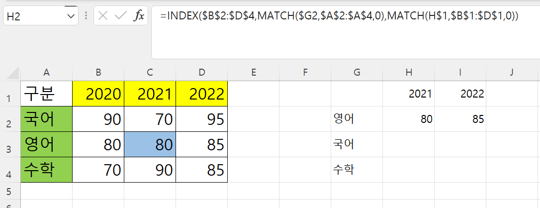 그리고 이어서 행의 위치는 MATCH(G2,A2:A4,0)로 사용하였는데요.