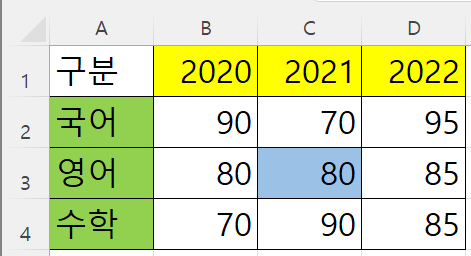 먼저 아래와 같이 연도별로 시험 성적이 있는 데이터를 생각해 봅니다.