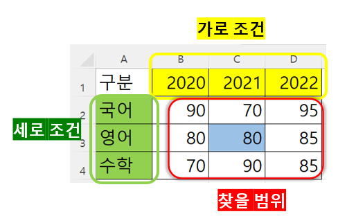 엑셀을 사용하다보면 행과 열의 조건을 맞는 값을 찾아야할 경우가 있습니다.