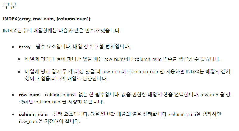 즉 INDEX(array, row_num, [column_num]) 의 구조로 작성되고,
