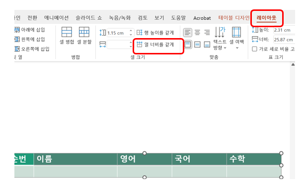 파워포인트에서 보고서를 작성할때 표 간격을 동일하게 할 필요가 있는데요.
