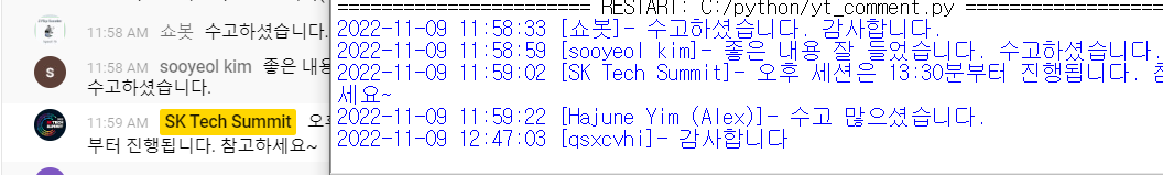오늘은 간단하게 유튜브 라이브 방송의 댓글을 긁어오는 방법을 알아보았는데요.