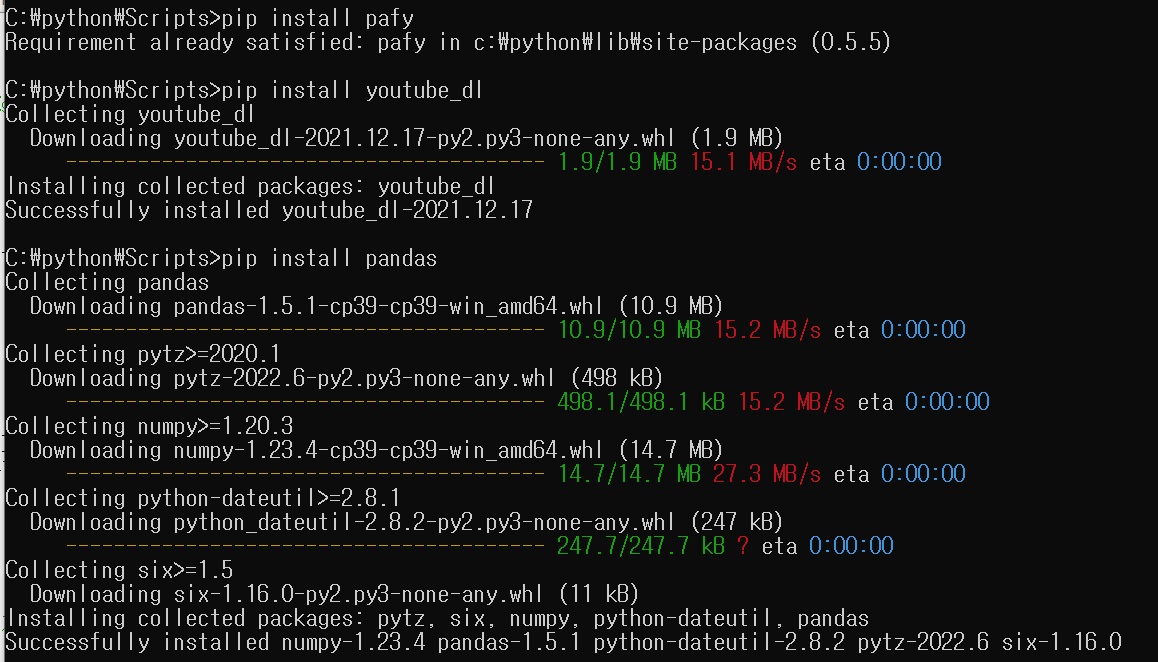 먼저 필요한 패키지는 pafy와 youtube_dl, 그리고 pytchat입니다.